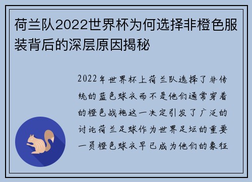 2022年世界杯上,荷兰队选择了非传统的蓝色球衣,而不是他们通常穿着的橙色战袍,这一决定引发了广泛的讨论。荷兰足球作为世界足坛的重要一员,橙色球衣早已成为他们的象征,深受球迷喜爱。然而,这次世界杯上,...